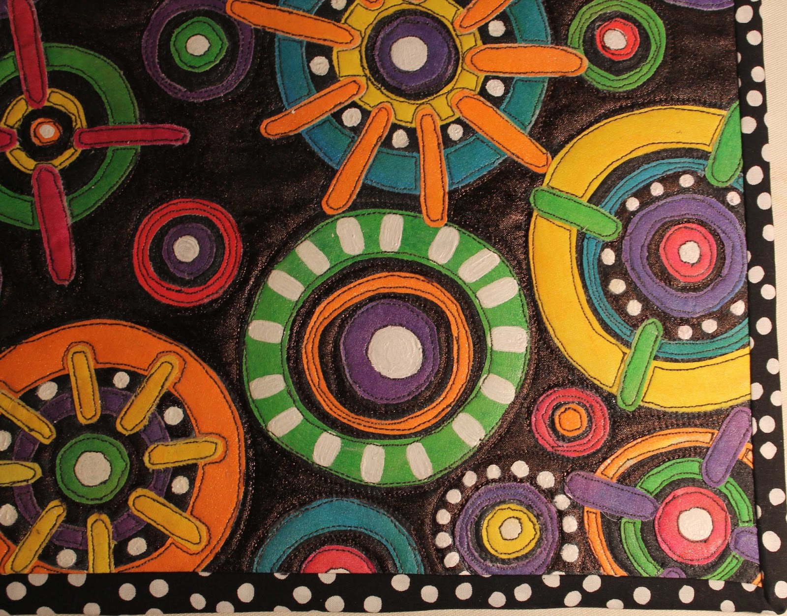 I like that it is a happy and colorful piece. Besides the binding, the quilt began with all white fabric. You also may notice that I varnished the quilt- I just felt it needed the shine; I am glad I did. I am not quite done with it yet; besides removing the painter's tape on the back holding the binding down on the back :-|, I would like to add a few beads on it.